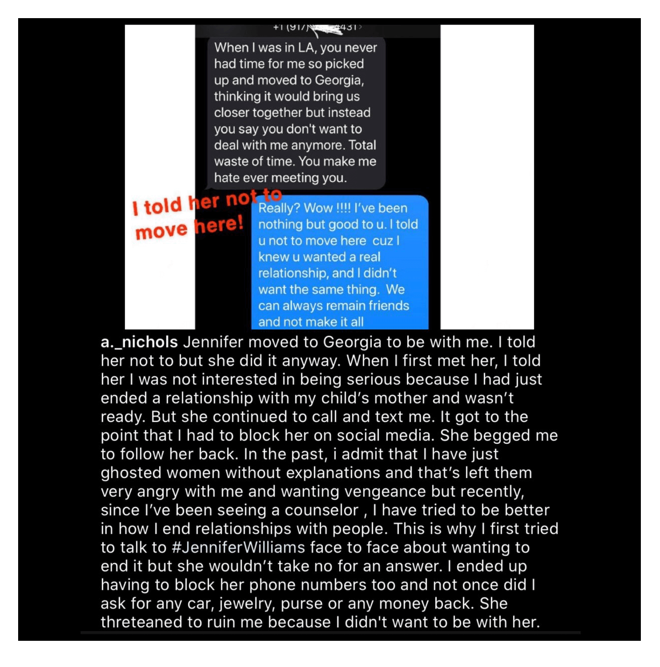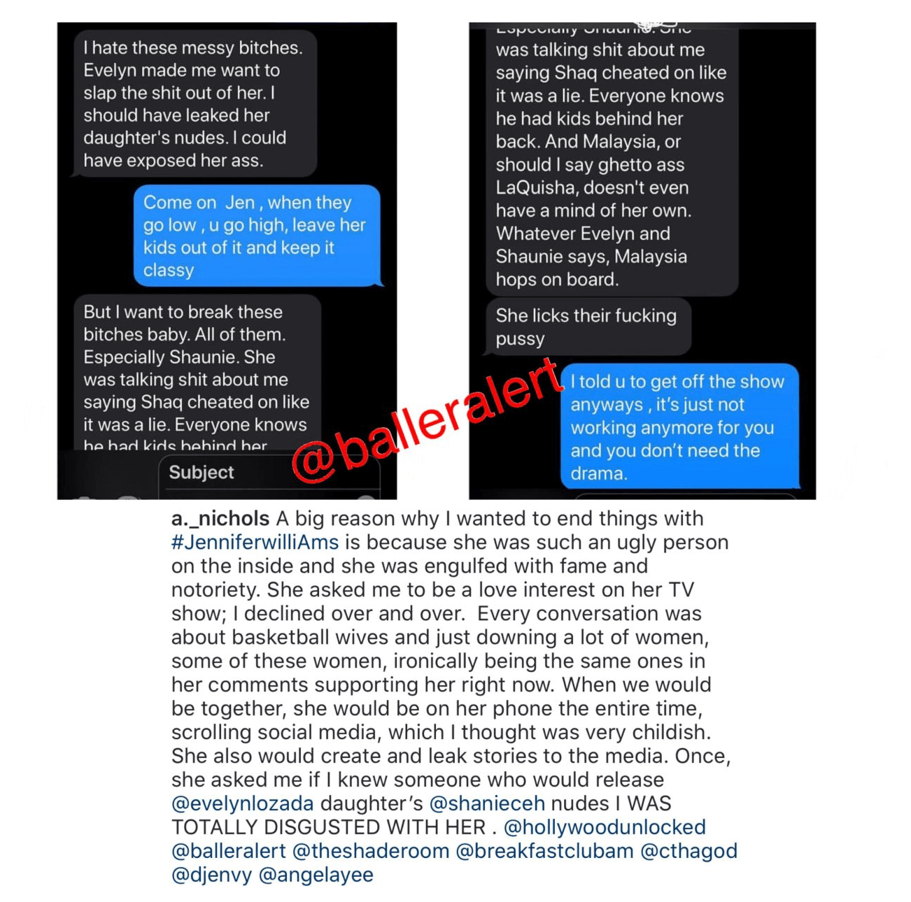 “A big reason why I wanted to end things with Jennifer Williams is because she was such an ugly person on the inside, and she was engulfed with fame and notoriety. She asked me to be a love interest on her TV show; I declined over and over,” Nichols wrote, posting several text message exchanges between him and Jennifer.