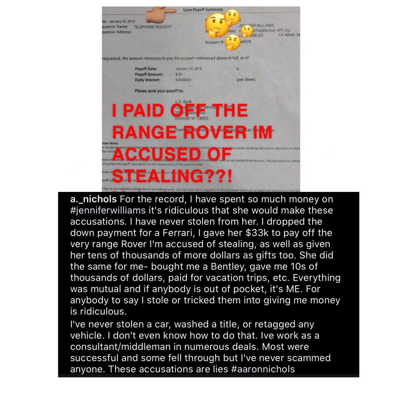 “I’m asking for some help finding my Range Rover that this man, Aaron Nichols, stole from me,” Jennifer wrote. “He has conned many women and men too out of vehicles and large amounts of cash.”