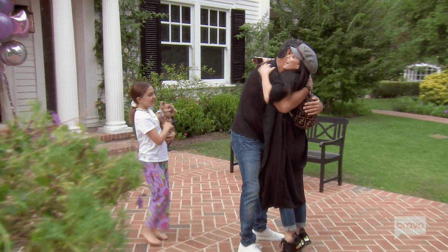 Kyle Richards finally arrives home from her extended travels to NYC for New York Fashion Week and then to North Carolina to film the sequel to Halloween. She quickly greets her family and then promptly rushes into the house to make out with her dogs. Okay, poor man’s Lisa Vanderpump. I see you. I’ll allow it but so help me if I catch you wearing a hot pink silk blouse with a pussy bow.