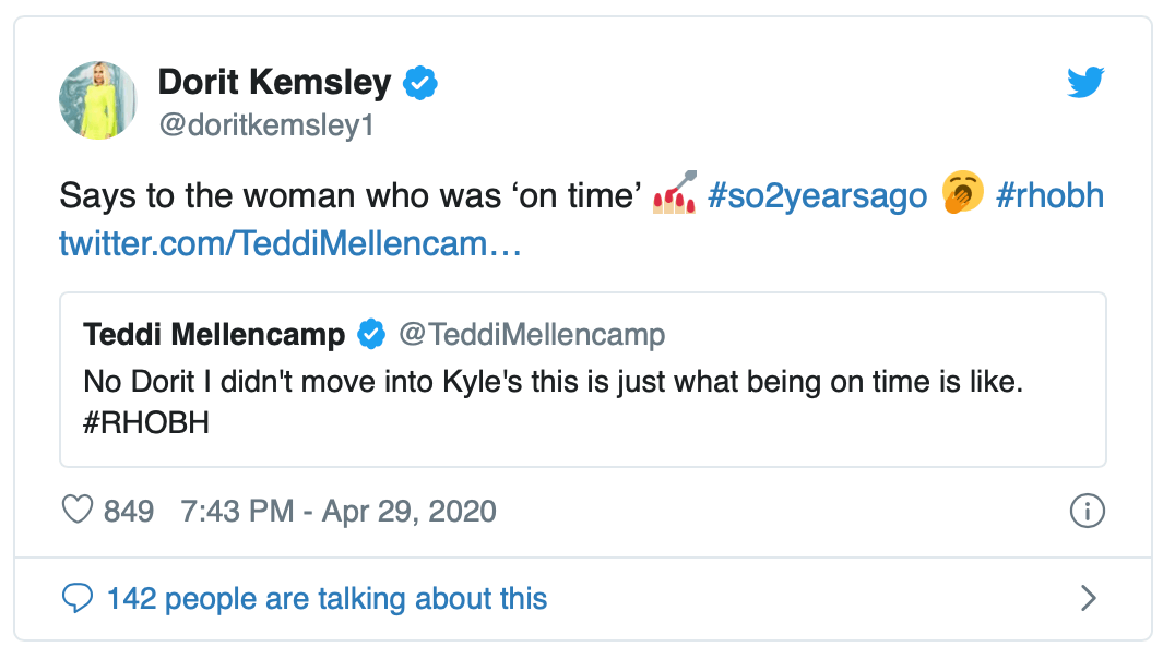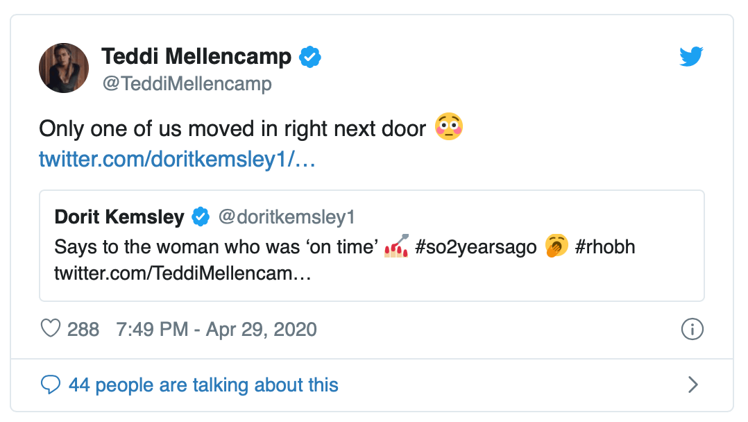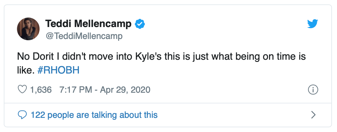 Teddi Mellencamp responded on Twitter, writing — “No Dorit I didn’t move into Kyle’s this is just what being on time is like.”