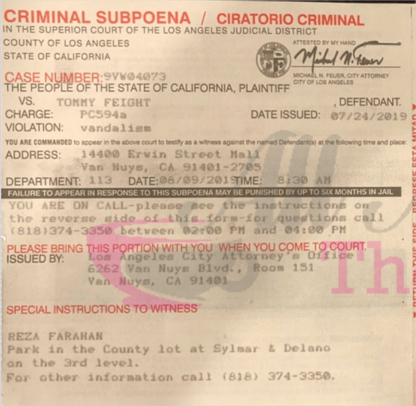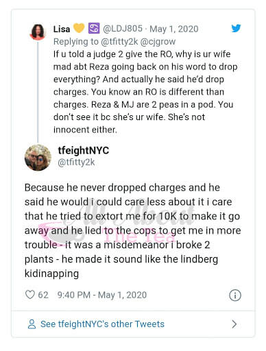 “Basically the court sought restitution for the value of items Tommy destroyed in my backyard, which was much more than some flower pots,” Reza explained. “He thinks it was 2 plants but he destroyed very expensive backyard furniture. He doesn’t remember dropping cactuses on that furniture, the covers were beige, now they are blue because we had to replace them.”