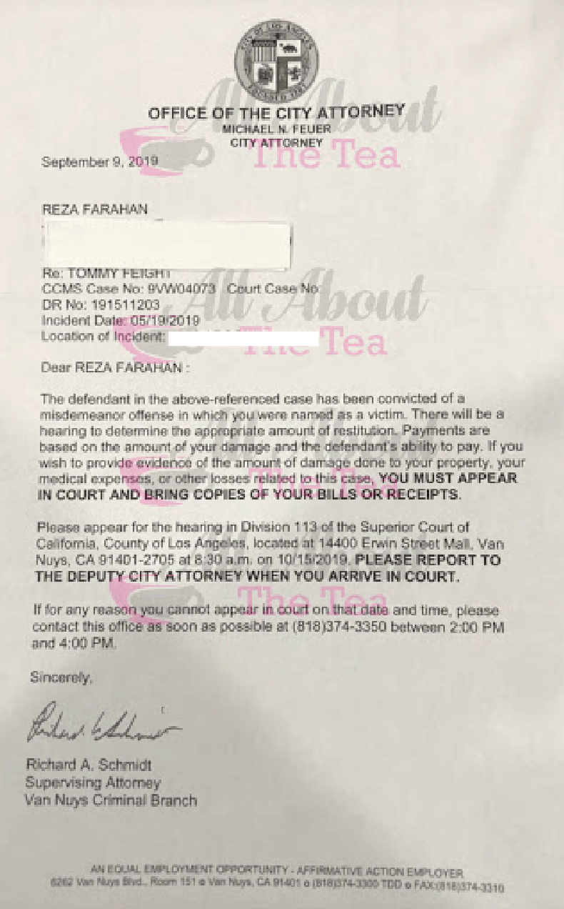 “We never sent in the subpoena, nor did we cooperate with the state in his criminal case. We just wanted the restraining order because of his temper.” Reza tells AllAboutTheTEA.com. However, Tommy was still convicted.