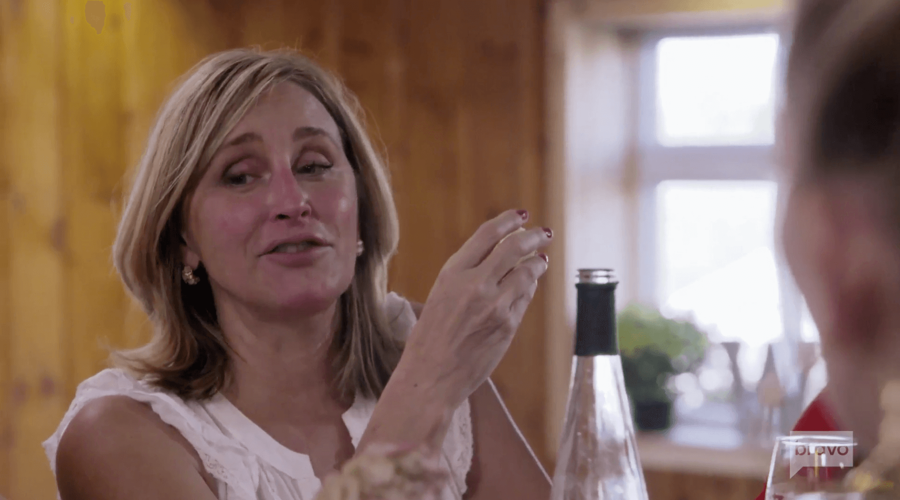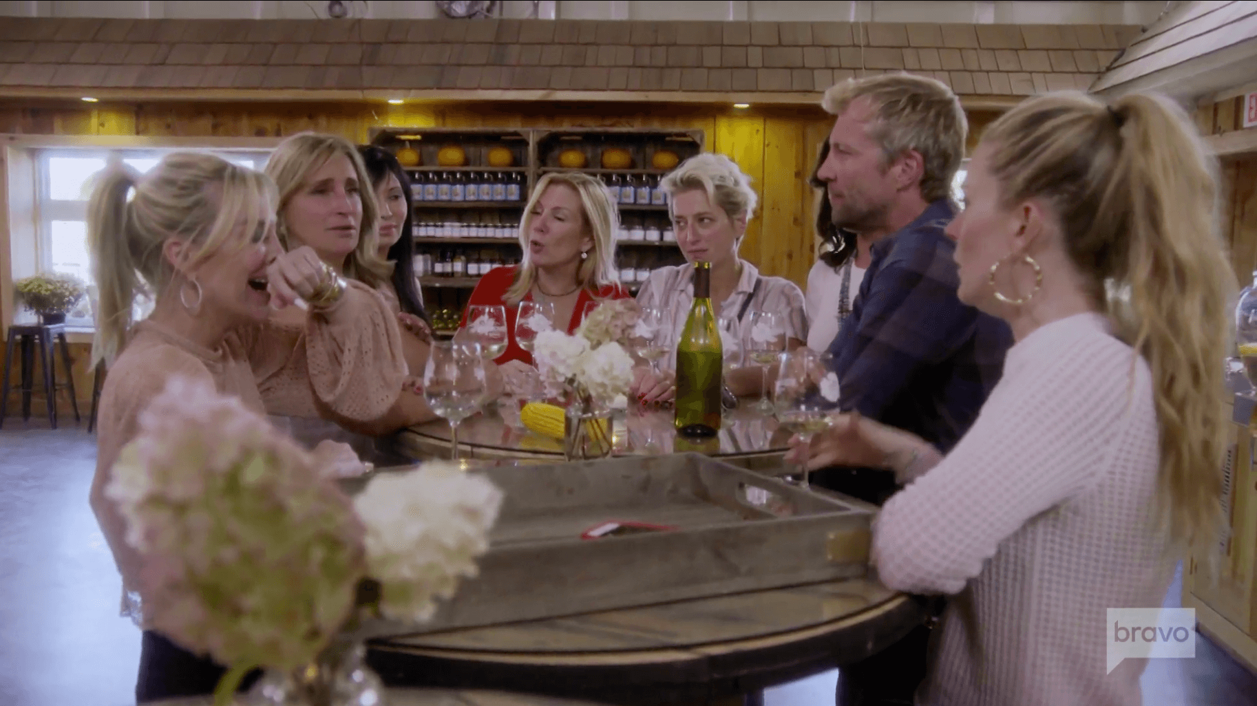 Inside at the wine tasting, Sonja drunkenly proclaims that cheese makes your p*ssy wetter. Tinsley is grossed out (as am I). Luann remarks that when Sonja drinks, she becomes a caricature of herself. Then Sonja claims she’d use Riesling as a lubricant and announces she got pounded hard the night before.