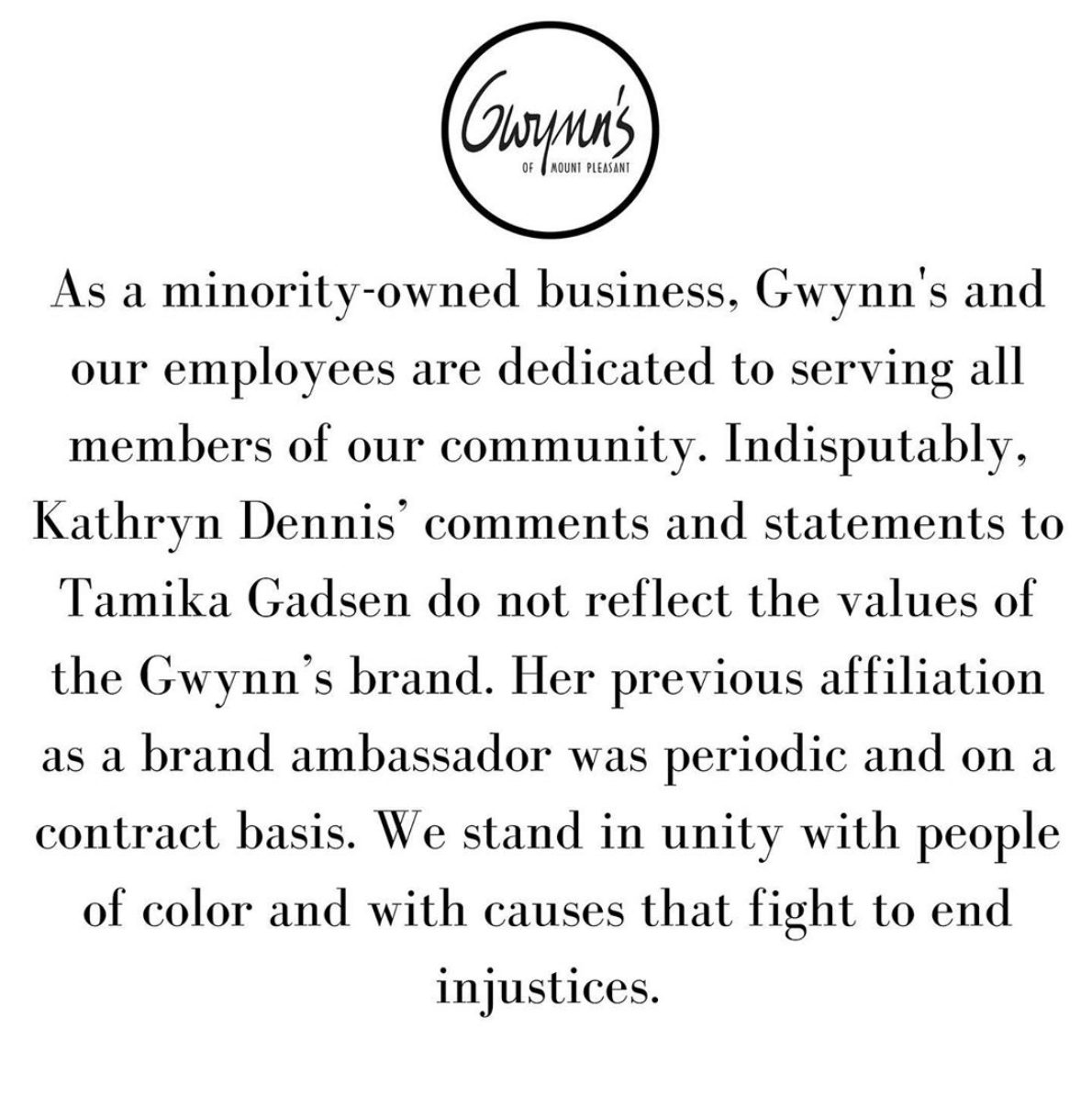 “As a minority-owned business, Gwynn’s and our employees are dedicated to serving all members of our community.” Gwynn’s caption starts. “Indisputably, Kathryn Dennis’ comments and statements to Tamika Gadsden do not reflect the values of the Gwynn’s brand.”