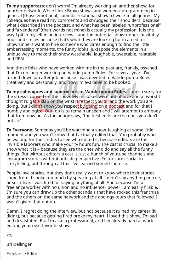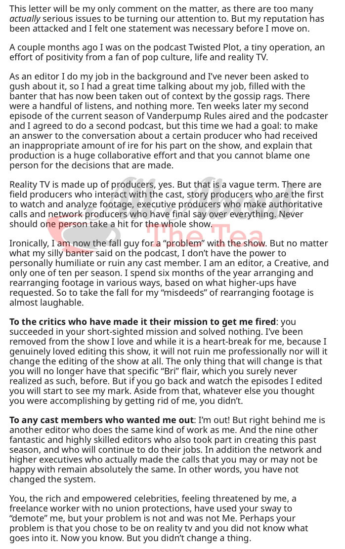 In her now-deleted apology, Bri Dellinger states other VPR editors will carry on her trend of bias editing. She also reminded the cast that many of the editing decisions are made by Bravo and its executives.