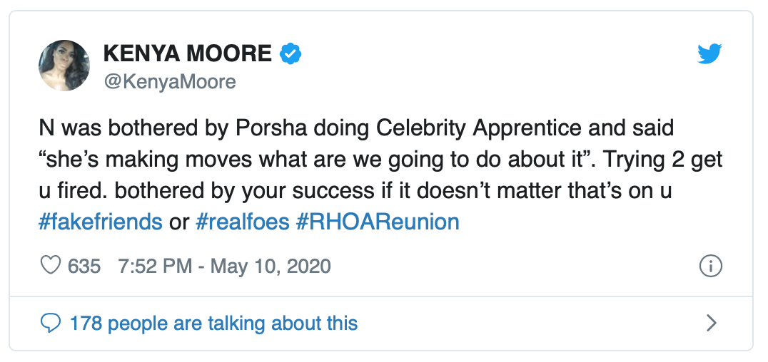 “[Nene] was bothered by Porsha doing Celebrity Apprentice and said ‘she’s making moves, what are we going to do about it.’ Trying [to] get [you] fired. Bothered by your success, if it doesn’t matter that’s on [you],” Kenya tweeted.