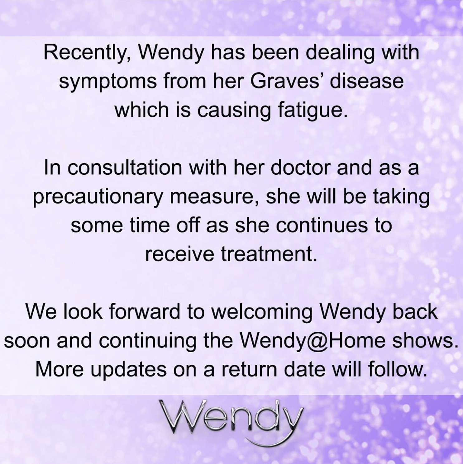 “Wendy has been dealing with symptoms from her Graves’ disease, which is causing fatigue,” a show spokesperson explained.