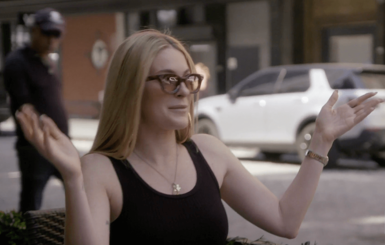 Next, Ramona arrives at the bathhouse. She’s given a hat to wear, but she’s less than impressed. She finds the spa a little rough around the edges — like Leah herself. Ramona zeroes in on Tinsley and tells her to let things go with Dorinda. Ramona slips into her swimsuit and lubes up her décolletage. If you don’t keep it moisturized, it becomes crepey — like Sonja’s bosom. And no one wants that! When Dorinda and Lu pop in, Tinsley ignores the elephant in the room. That elephant being Dorinda. Sonja arrives and is freaked out. There’s graffiti all around out here. And there are bars on shop doors. This is why she avoids downtown. Because it’s gross!
