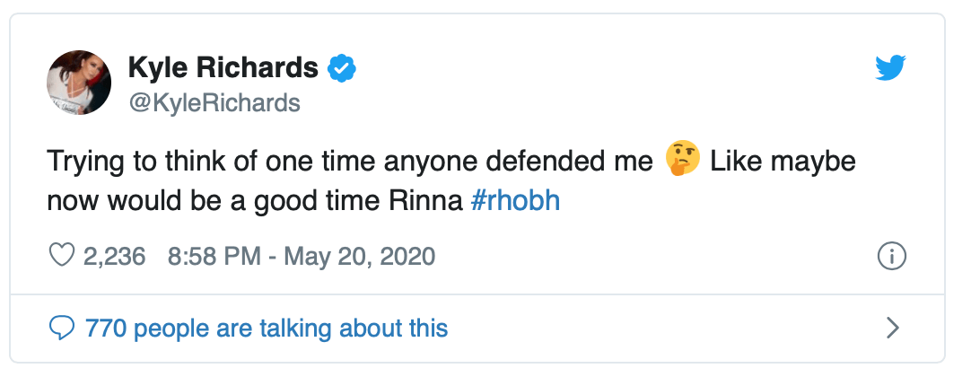 Kyle Richards sounded off on Twitter about feeling abandoned by Lisa Rinna, after a cast dinner went south.