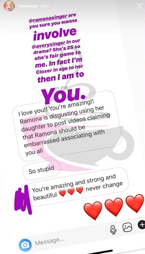 “@ramonasinger are you sure you wanna involve @averysinger in our drama? She’s 25 so she’s fair game to me. In fact, I’m closer to in age to her then I am to You,” Leah McSweeney wrote.