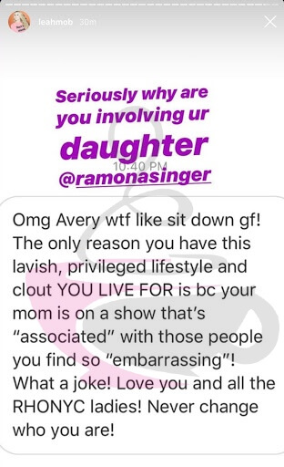 Leah McSweeney responded on her own Instagram story, reposting supportive comments from a fan account. The RHONY rookie fired shots in additional commentary, warning Ramona Singer that her daughter was “fair game.”