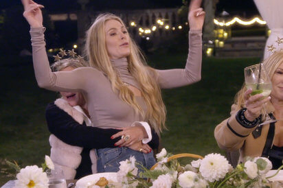 As Leah continues to sit on Sonja Morgan’s lap, she yells at Tinsley and interrupts Dorinda’s toast. Ramona is now getting annoyed, and Sonja, who’s not exactly sober, is squeezing Leah’s breasts. Ramona accuses Sonja of encouraging Leah’s drunken behavior.