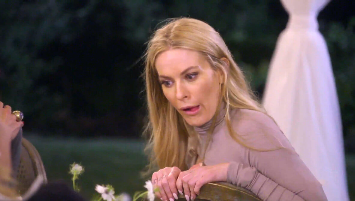 Dorinda Medley and Tinsley hug, while Leah is destroying the floral arrangements and tossing her glass on the ground. The waiters can’t even serve the food because Leah is bopping all around the table. She begs to speak to Ramona alone, but Ramona refuses. She tells Leah she’s out of control. Leah points out that with this crew, someone is always out of control.
