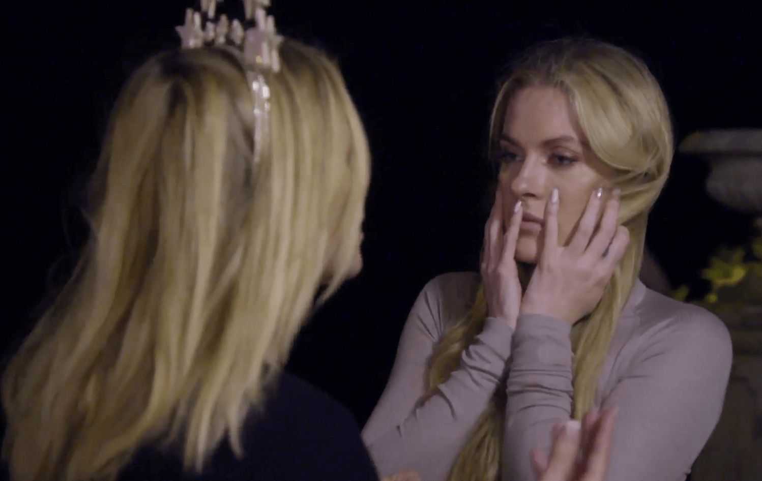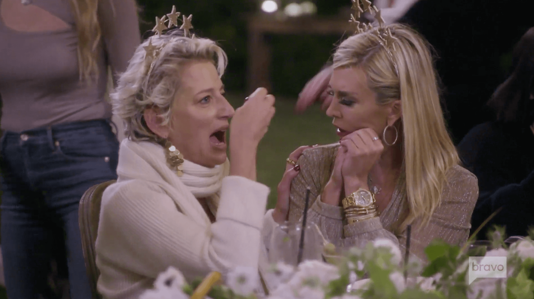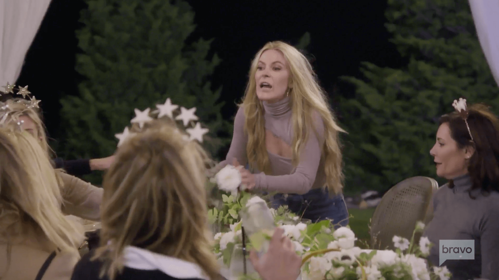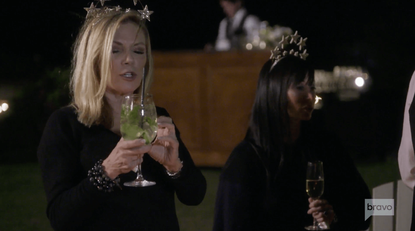 The dinner table is set up outdoors with candles and a firepit. Ramona brought crowns for everyone. Luann dons her star crown and says she’s been rethinking the invitation to Leah’s sister. Why did she want to invite Sarah at the last minute? That’s weird, right? Since Luann was one of the yay votes, it seems strange that she’s now having second thoughts. I mean, it’s just one night. One dinner. What is the problem?