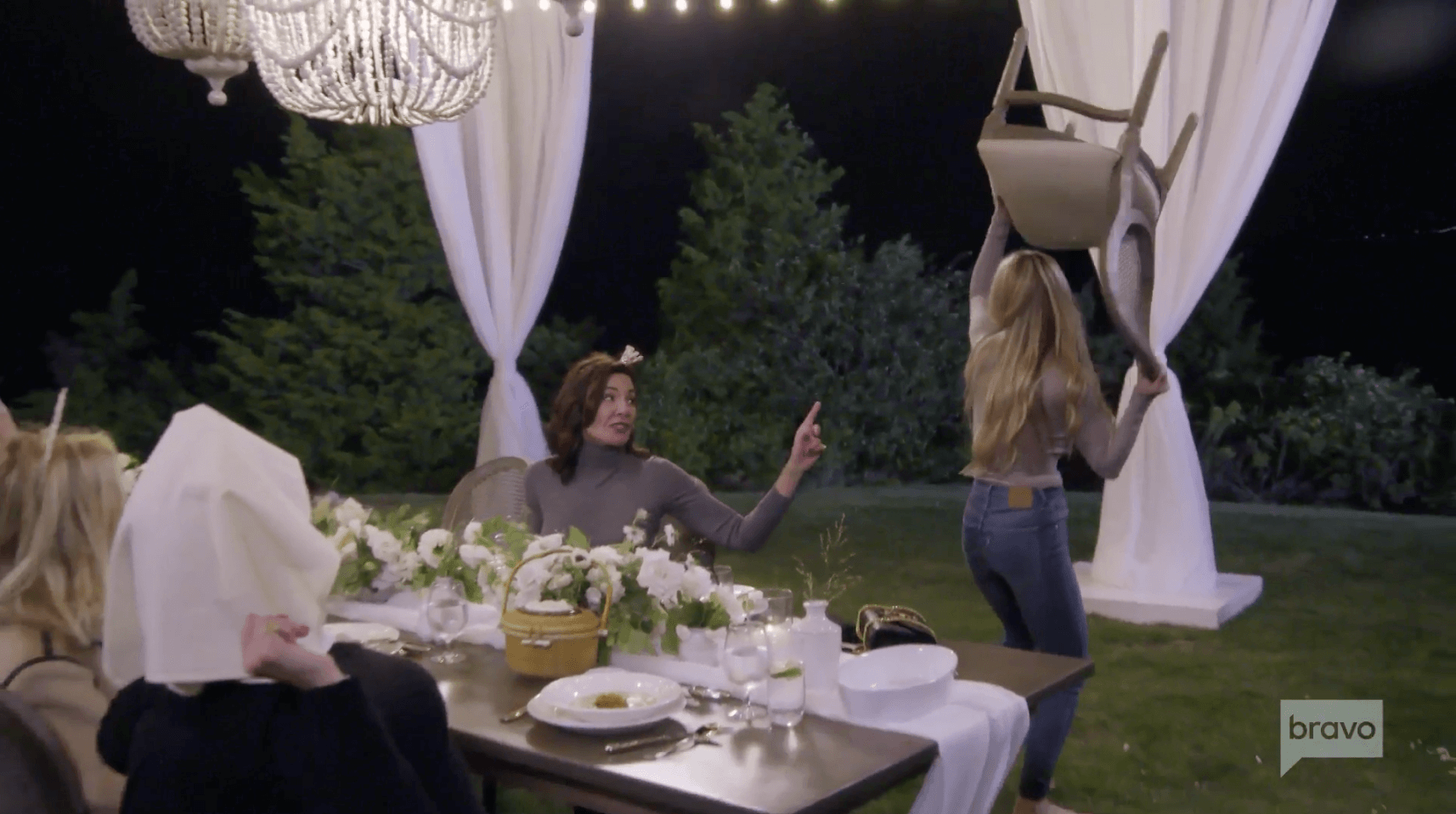 Elyes tries to physically wrangle Leah back to the table, but Leah throws her off. Then Leah tries to dismantle the material that’s decorating the four posts framing the table. As Dorinda approaches her, Leah performs a summersault on the grass. My Lord, this woman is nuts, and I’m down for every second!