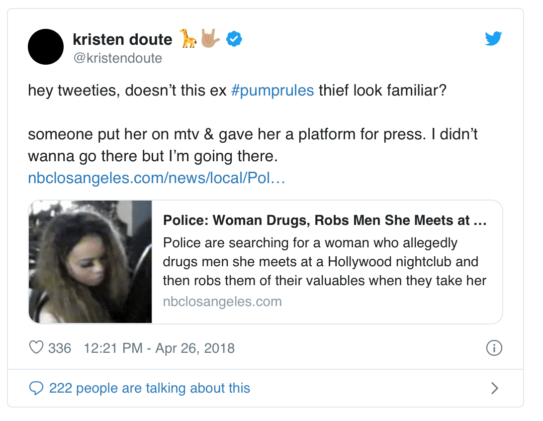 During a 2018 broadcast of Bitch Bible podcast, Stassi Schroeder said she and Kristen Doute compared Faith’s hair and tattoos to the security footage from the robberies and contacted the police because they saw a resemblance.