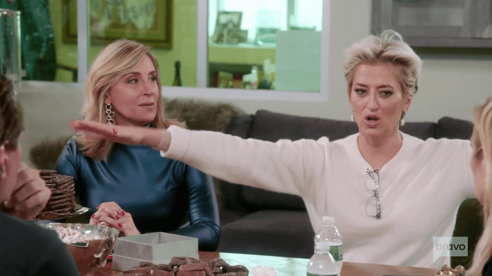 When Sonja Morgan arrives, she hugs Dale and lifts her off the ground, which almost busts a lamp. But Tinsley has quick hands and rescues it. Now that Sonja realizes Tinsley is serious about getting back together with Scott, she offers her congrats, saying she’s happy for Tinsley.