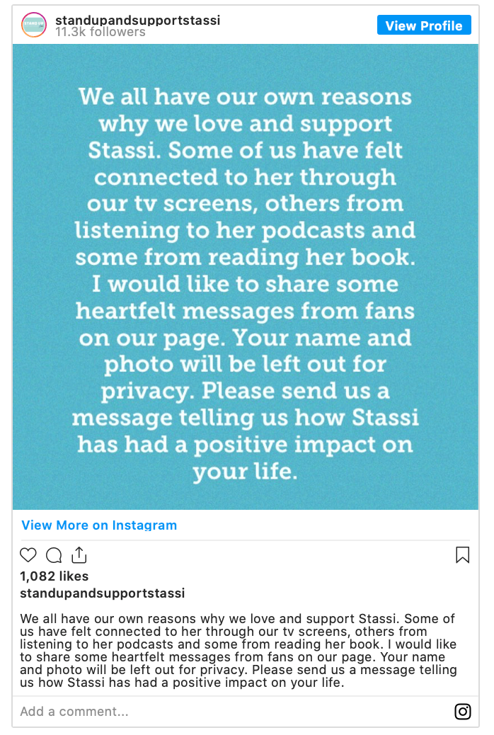 Dayna Schroeder has been tagging responses to supportive fans with Instagram account — @standupandsupportstassi.