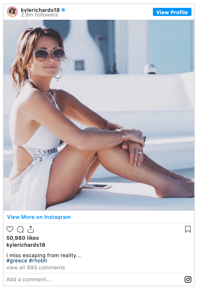 Kyle Richards, rocking a crocheted one piece, wrote “I miss escaping from reality…” the RHOBH star adding the hashtags, “Greece,” and “RHOBH.”