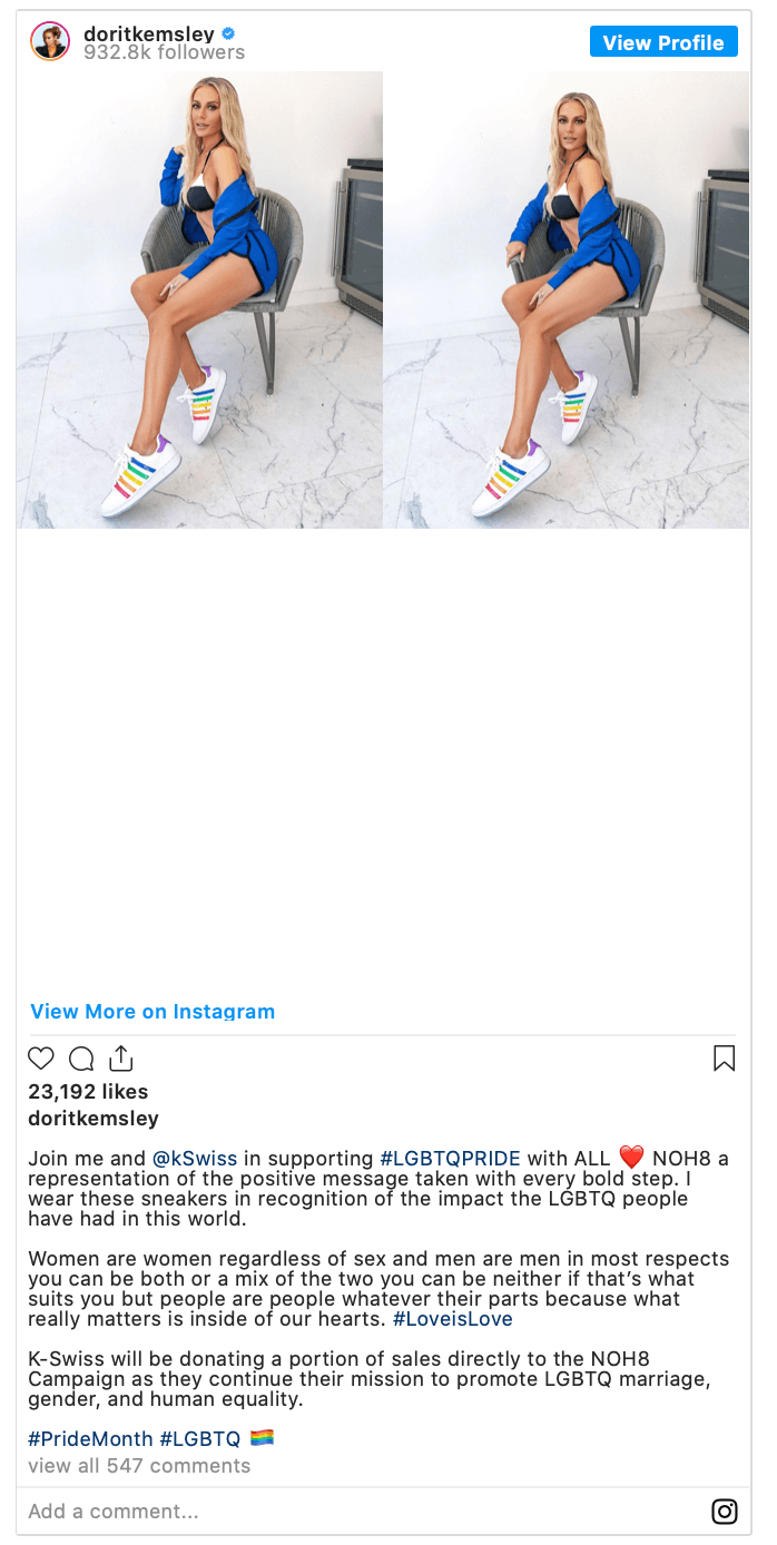 “Join me and @kSwiss in supporting #LGBTQPRIDE with ALL,” Dorit captioned the sneaker snaps. “NOH8 a representation of the positive message taken with every bold step. I wear these sneakers in recognition of the impact the LGBTQ people have had in this world.”