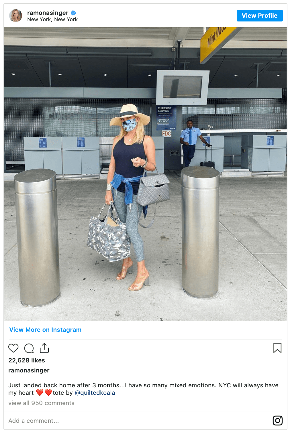 Ramona Singer was seldom seen in a mask in the dozens of shared pics, but did cover up for her reentry into New York.