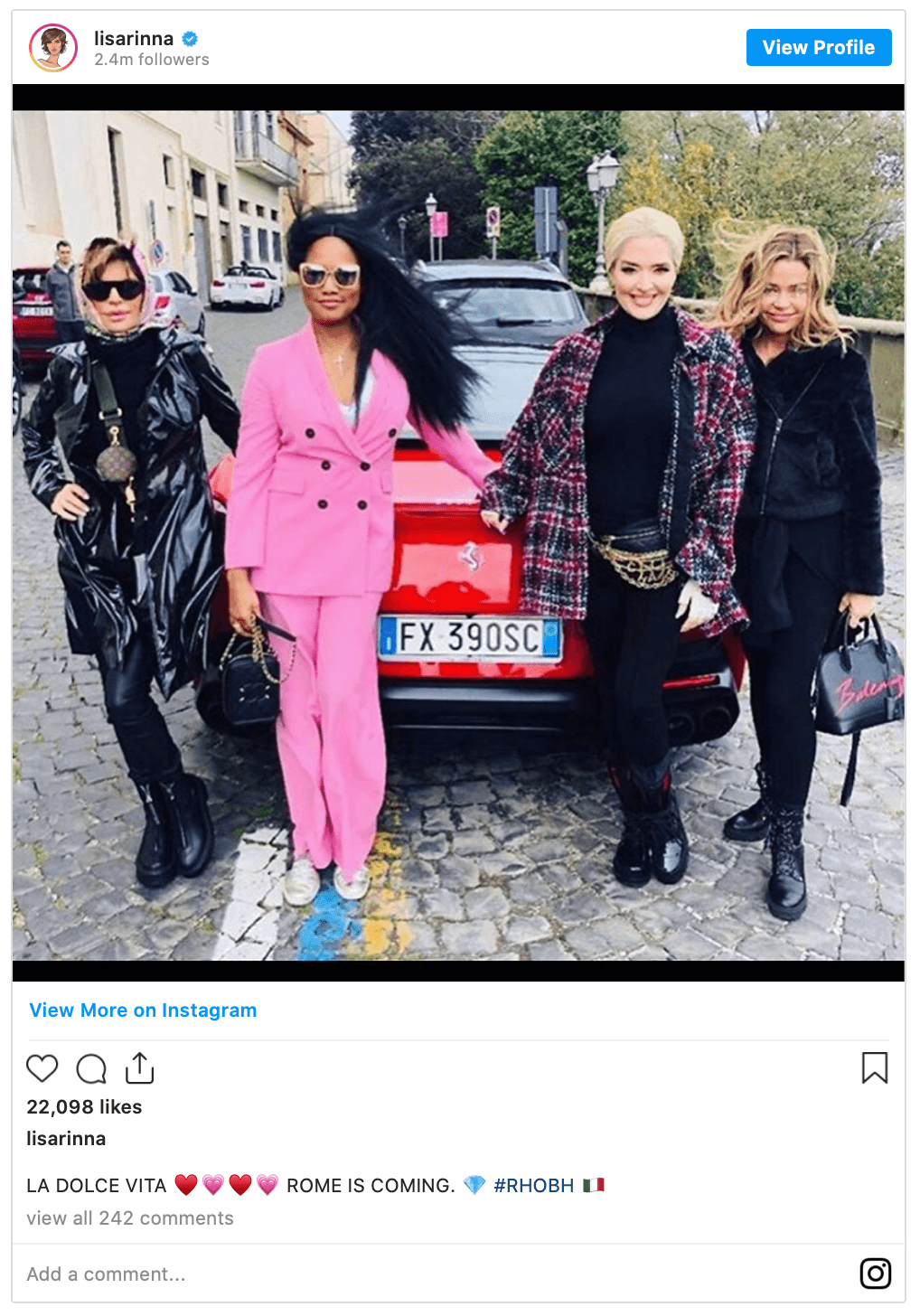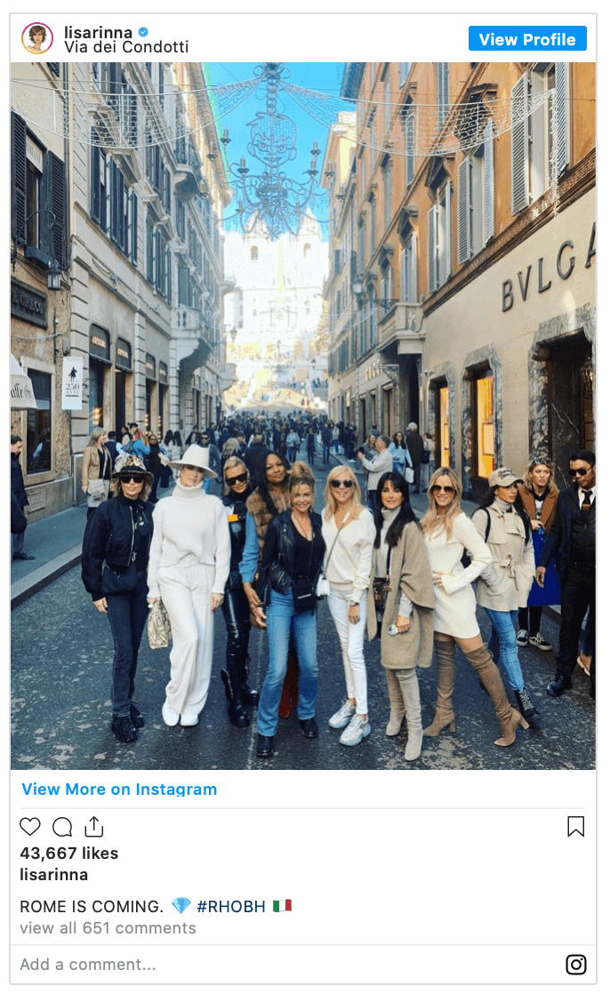 Rinna shadily posted two “ROME IS COMING” cast snaps on Instagram after Brandi Glanville’s kiss-pic release — reminding viewers that the cast is about to sound off about the rumored affair.