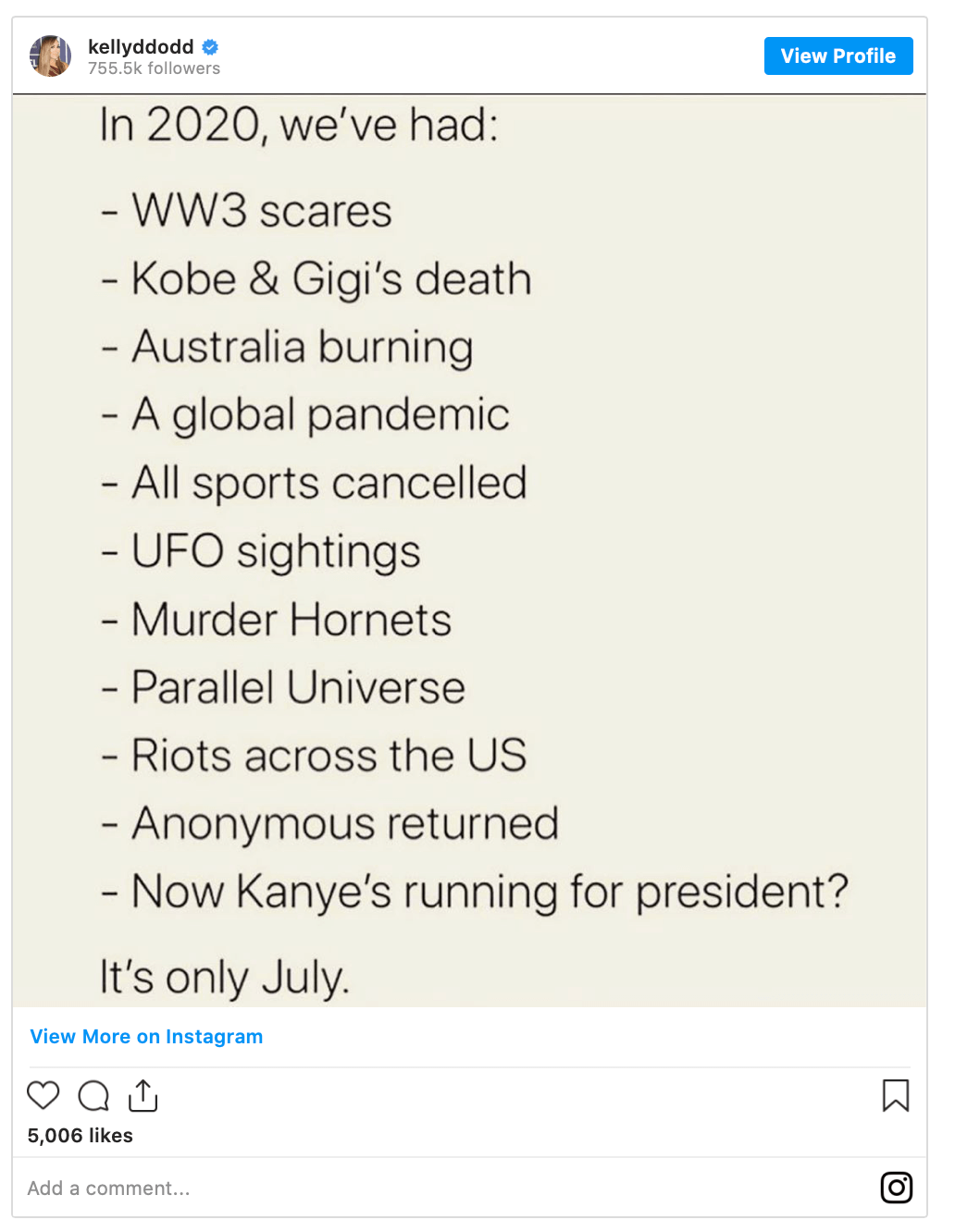Kelly Dodd is getting dragged again by The Real Housewives of Orange County fans after she posted meme listing all the things that have gone wrong in 2020.