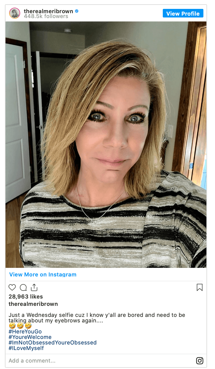 Meri Brown posted a selfie on Instagram on Wednesday — labeling her followers “bored” and obsessed with her typically wonky eyebrows.