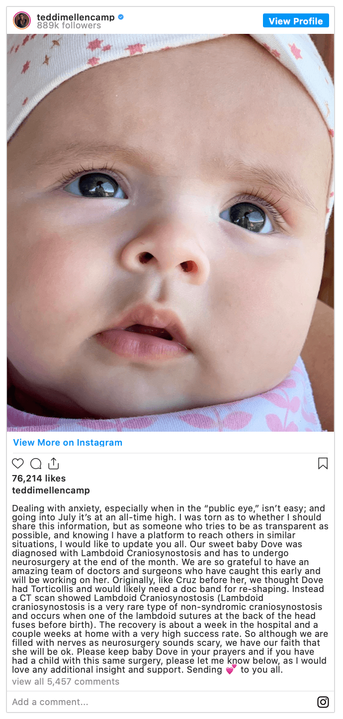 Teddi Mellencamp explained that doctors were able to detect the condition early. “We are so grateful to have an amazing team of doctors and surgeons who have caught this early and will be working on her. Originally, like Cruz before her, we thought Dove had Torticollis and would likely need a doc band for re-shaping. Instead a CT scan showed Lambdoid Craniosynostosis (Lambdoid craniosynostosis is a very rare type of non-syndromic craniosynostosis and occurs when one of the lambdoid sutures at the back of the head fuses before birth).”