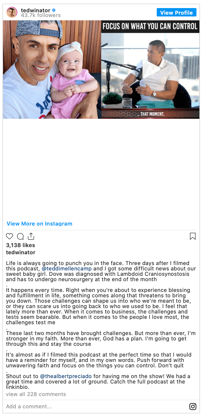 “It happens every time. Right when you’re about to experience blessing and fulfillment in life, something comes along that threatens to bring you down,” his post continued. “Those challenges can shape us into who we’re meant to be, or they can scare us into going back to who we used to be. I feel that lately more than ever. When it comes to business, the challenges and tests seem bearable. But when it comes to the people I love most, the challenges test me.”