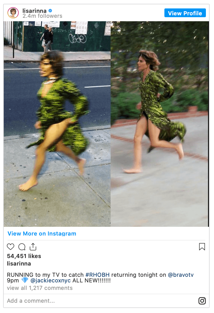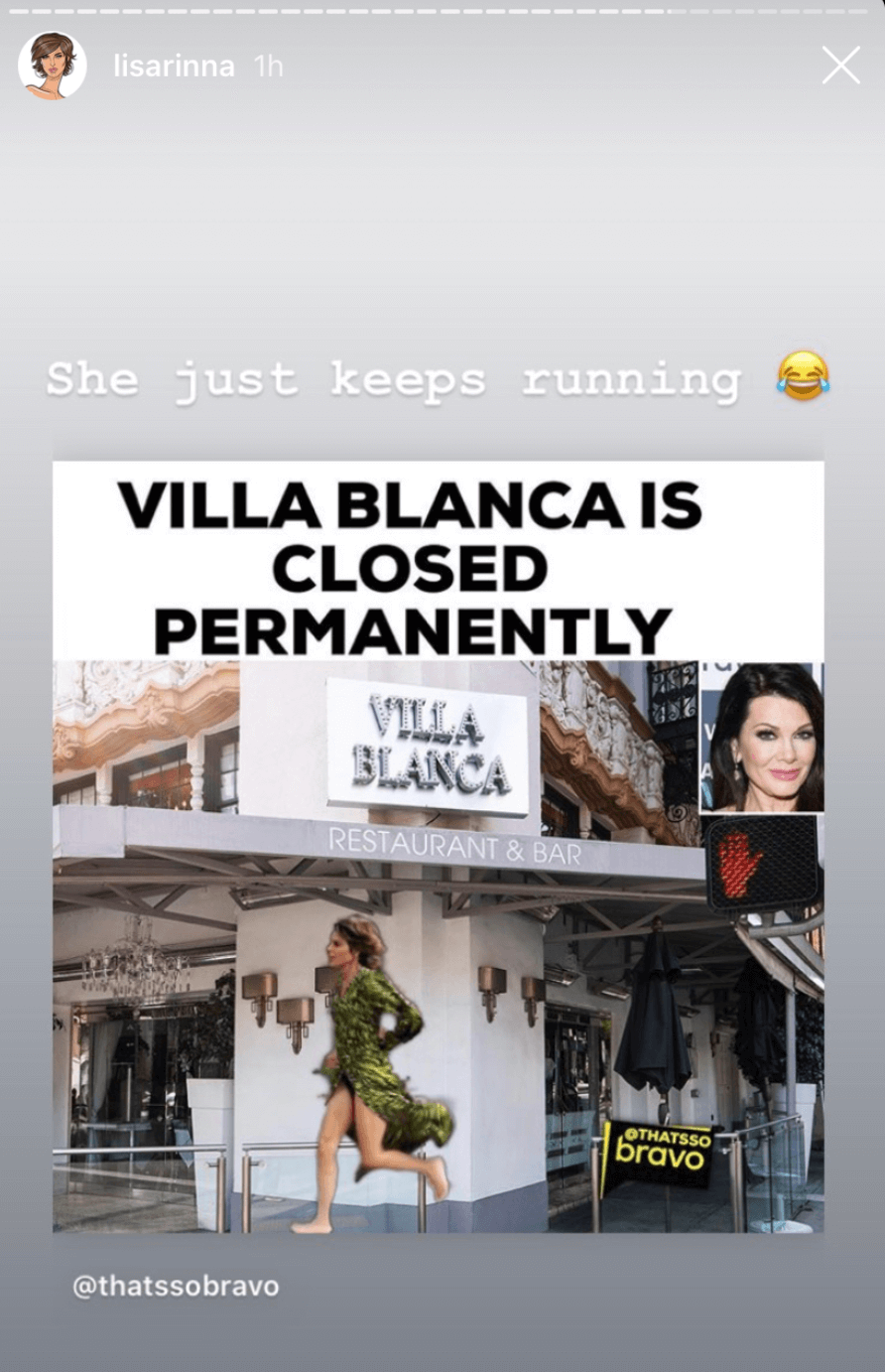 Lisa Rinna trolled her ex cast-mate in a recent Instagram blast, reposting an original meme from a Bravo fan account. The meme slapped a photoshopped image of Rinna’s RHOBH run on a photo of Vanderpump’s recently shuttered eatery, Villa Blanca. “She just keeps running ?” Rinna snarked over the post.