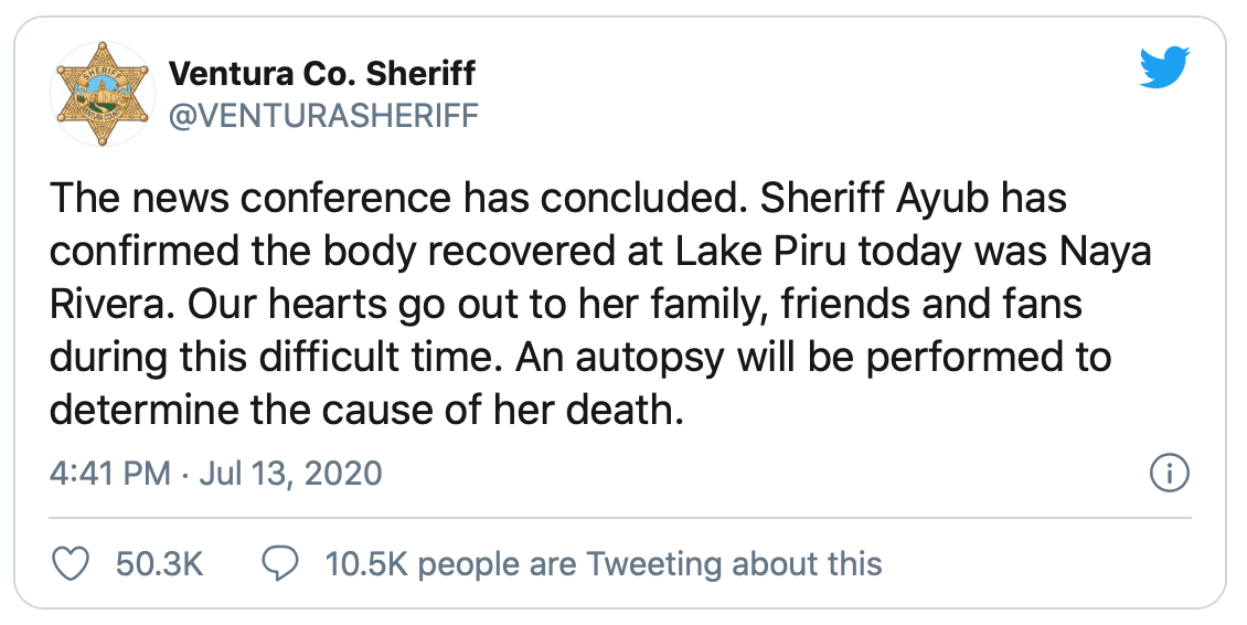 Naya Rivera vanished on July 8 while out on the California lake with her four-year-old son. After five days of searching, the Ventura Sheriff’s Office identified Naya Rivera, after a body was discovered, on Monday, July 13. Authorities confirmed that an autopsy would be conducted, to determine the cause of her death.