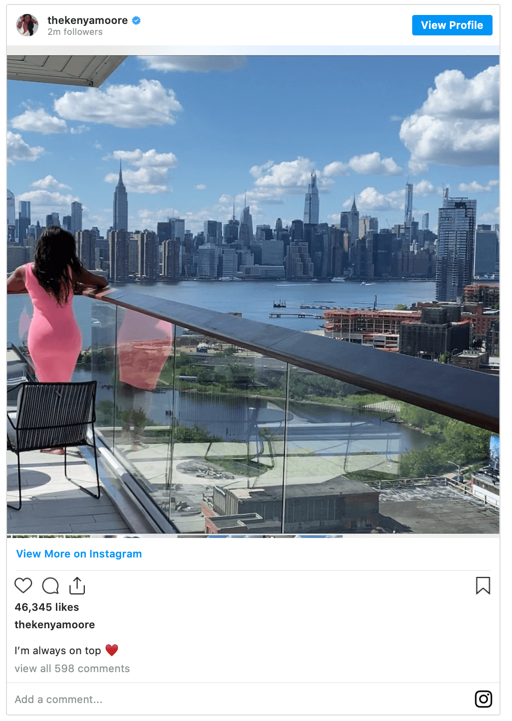 Kenya Moore confirmed on Instagram that she was in the former COVID19 epicenter, on Wednesday. The Bravoleb shared a photo from her hotel — the reality mom snapped on a terrace, taking in the city skyline. “I’m always on top,” Kenya Moore captioned the snap.