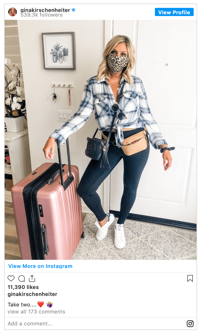 Gina Kirschenheiter posted an Instagram photo of herself holding a suitcase along with the caption, ”here’s a novel idea, quarantine us all together. I’m sure it’s gonna go great,” before quickly updating it to ”take two.”
