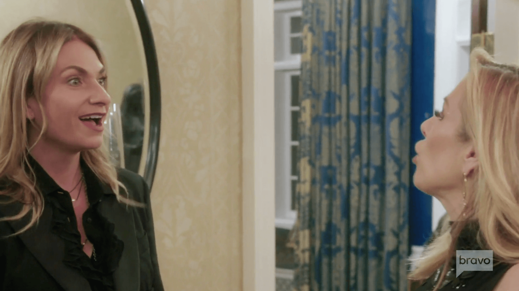 As Ramona Singer is expounding on how Sonja Morgan used to do her own take on the genre and call it cabralesque, Lu walks in and stares at Ramona, assuring her she’s overheard every word. The look on Ramona’s guilty face is hysterical. She’s been caught gossiping, and she can’t zip her lip fast enough.