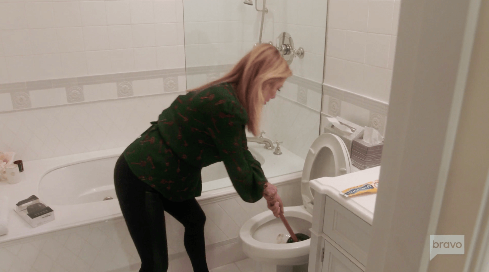 Leah steps into Ramona’s room. Ramona confesses that her toilet won’t flush. There’s a little poop floating around in there, so Leah goes and gets her hostess. Now, Dorinda and Ramona stand nose to nose and kind of seductively talk about Ramona’s bowel movements. It’s weird, I’m not going to lie. Ultimately, they don’t fix the toilet.