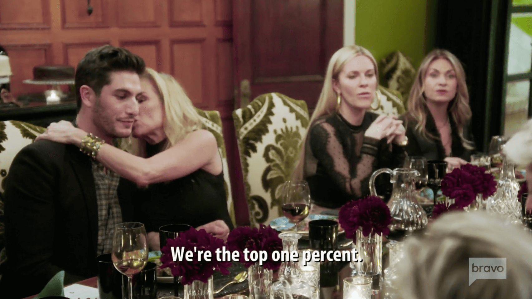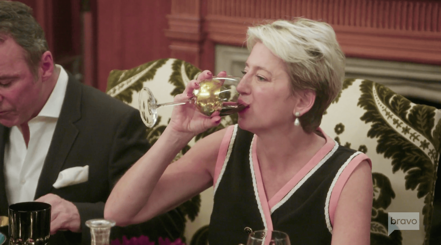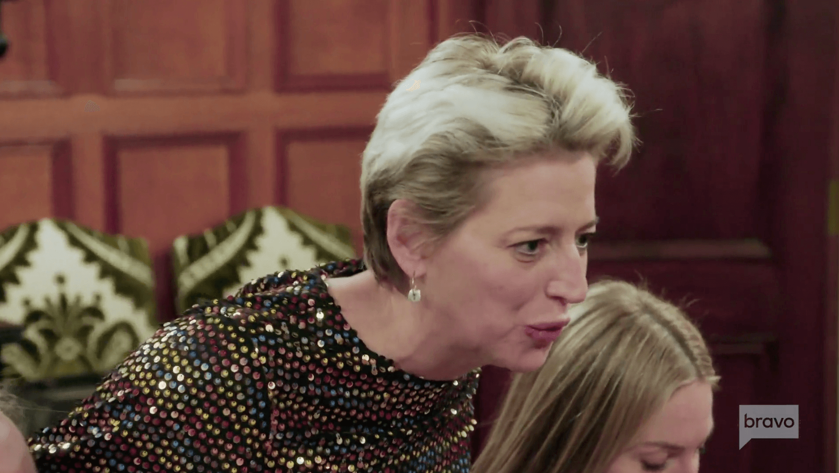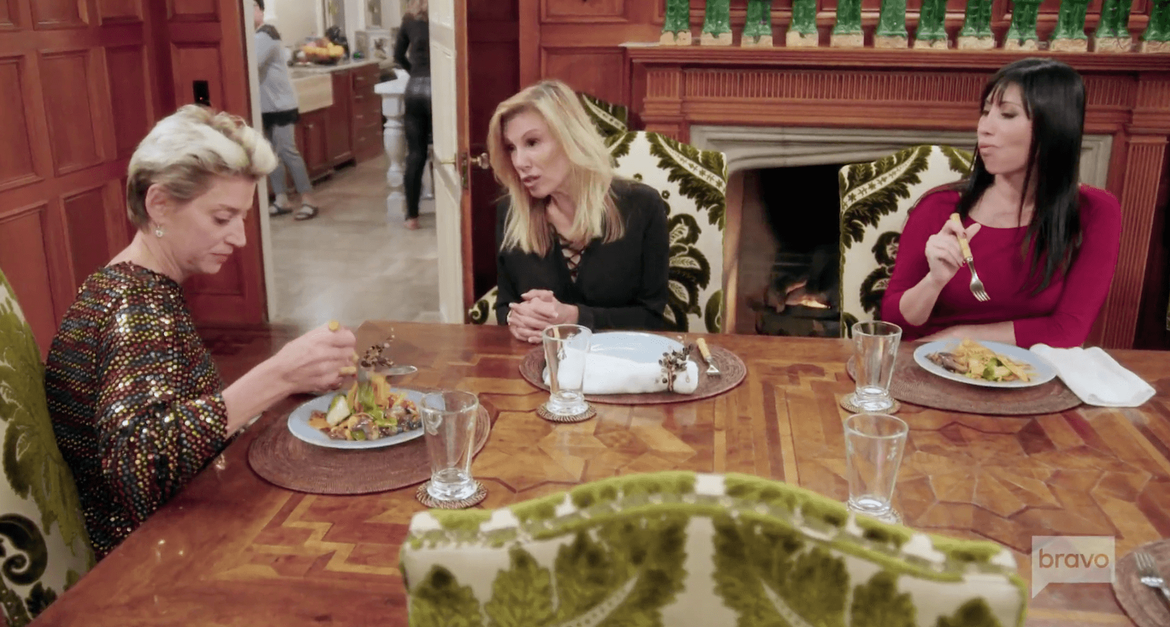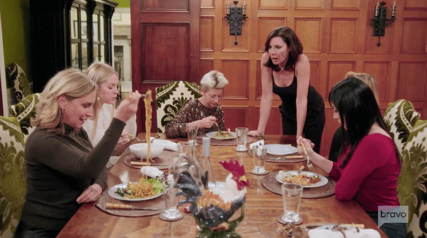 Sonja is so shitfaced, she’s piling noodles into her gob while yelling that Luann disrespected her. Sonja doesn’t want to be in the show without getting paid? Fine. She’s out. But Ramona and Dorinda both stand up to Luann, saying Sonja just wants to be compensated for her performances. No way, Lu says. She’s not paying Ms. Morgan a dime.