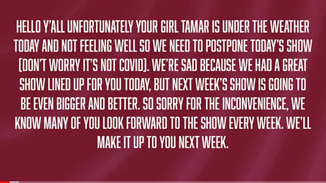 “Hello y’all unfortunately your girl Tamar is under the weather today and not feeling well so we need to postpone today’s show (Don’t worry it’s not COVID). We’re sad because we had a great show lined up for you today, but next week’s show is going to be even bigger and better. So sorry for the inconvenience, we know many of you look forward to the show every week. We’ll make it up to you next week.”