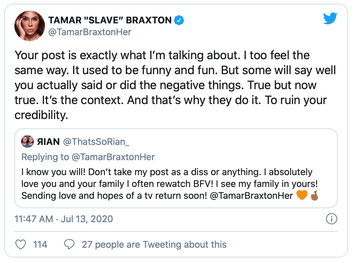 She also expressed her disappointment in how the networks have chosen to portray black reality stars. ”Your post is exactly what I’m talking about. I, too, feel the same way. It used to be funny and fun,” she said to a fan.