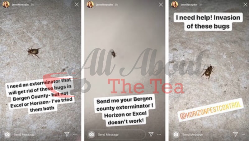 Jennifer Aydin shared several photos of bugs crawling around her New Jersey mansion on Instagram. ”I need an exterminator that will get rid of these bugs in Bergen County-but not Excel or Horizon- I’ve tried them both,” she posted on one of her stories. ”I need help! Invasion of these bugs,” she cried out on a separate story.
