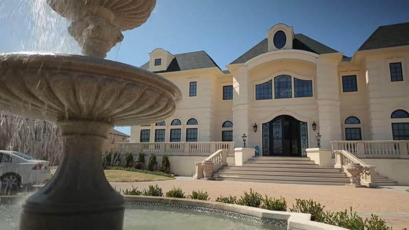 The home features a pool house, a two-story indoor basketball court, and 16 bathrooms.