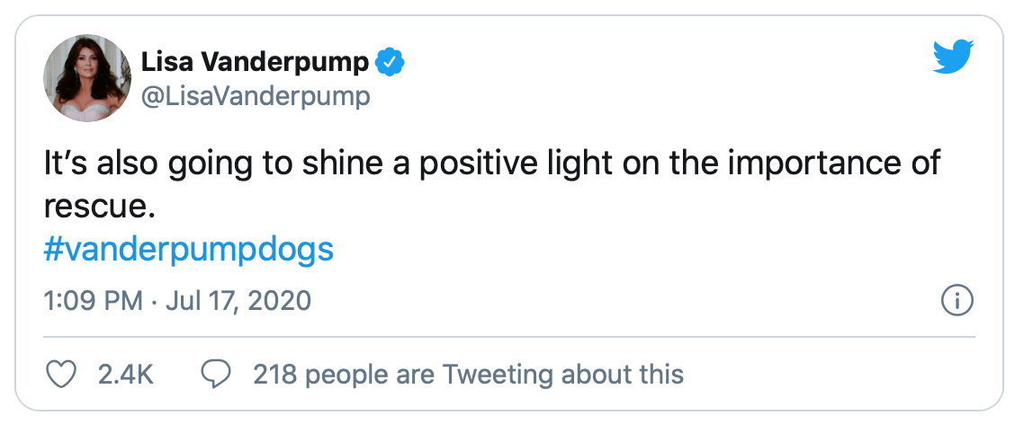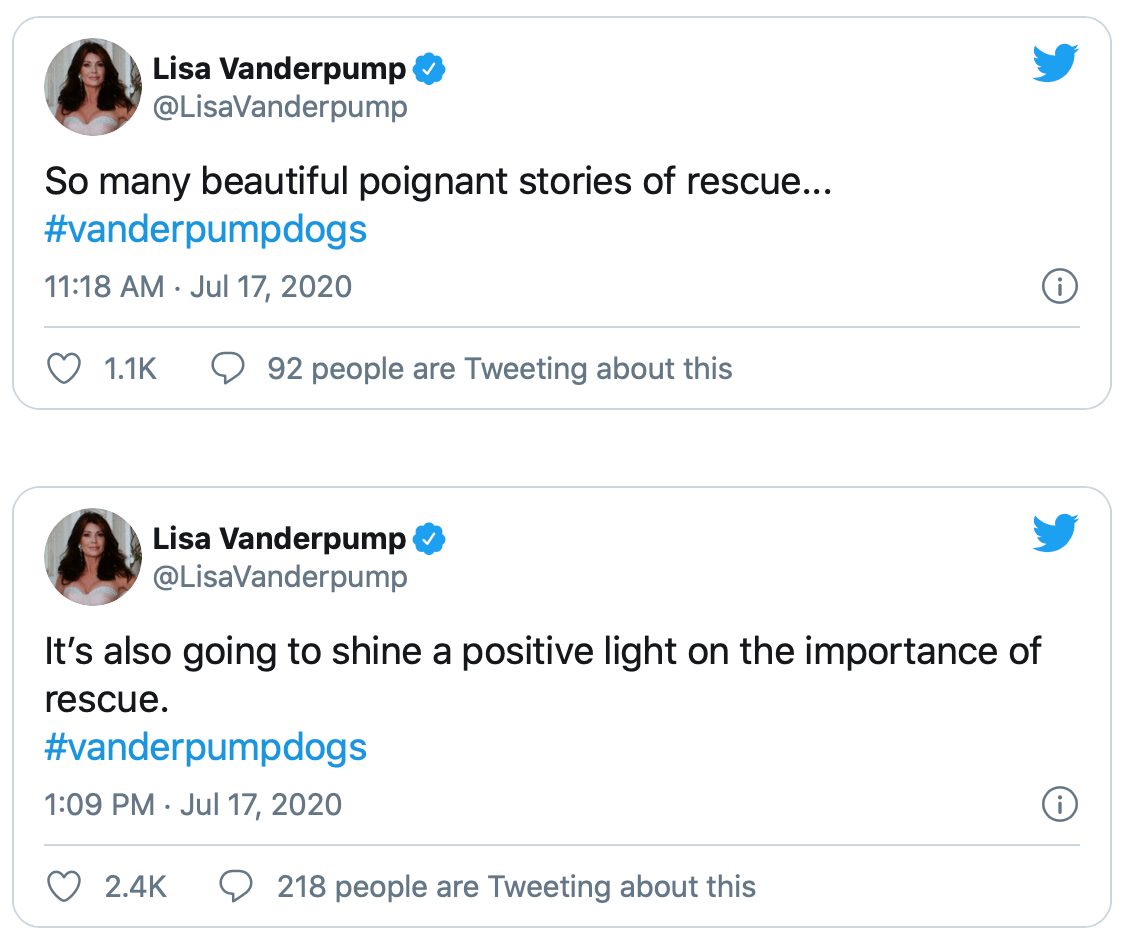 Lisa Vanderpump also shared some information on what viewers can expect to see on the show. ”So many beautiful poignant stories of rescue. #vanderpumpdogs,” she tweeted. “It’s also going to shine a positive light on the importance of rescue. #vanderpumpdogs.”