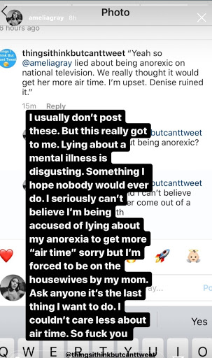 “I usually don’t post these. But this really got to me. Lying about a mental illness is disgusting. Something I hope nobody would ever do. I seriously can’t believe I’m being accused of lying about anorexia to get more ‘air time’ sorry, but I’m forced to be on the show by my mom. Ask anyone it’s the last thing I want to do. I couldn’t care less about air time. So fuck you,” she said.