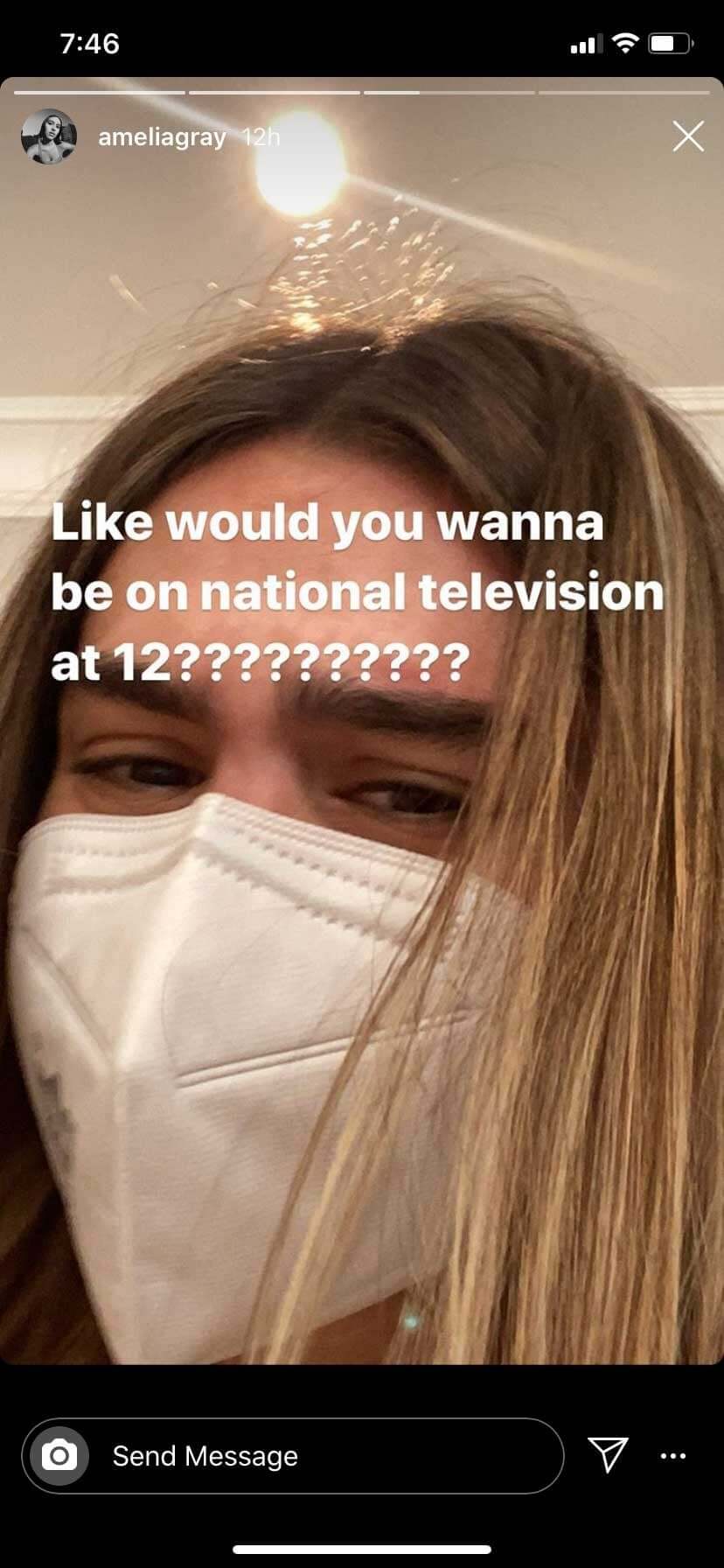 Amelia Hamlin went on to share two pics of herself sporting a mask, asking her followers alongside one selfie, “Like would you wanna be on national television at 12???????????”