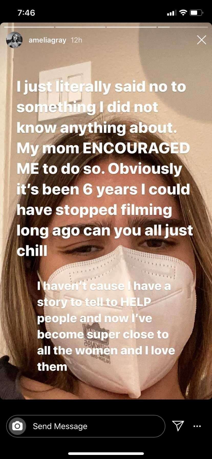 “I just literally said no to something I did not know anything about. My mom ENCOURAGED ME to do so,” Amelia added alongside her second selfie. “Obviously it’s been six years. I could have stopped filming long ago. Can you just all chill? I haven’t ’cause I have a story to tell to HELP people and now I’ve become super close to all the women and I love them.”