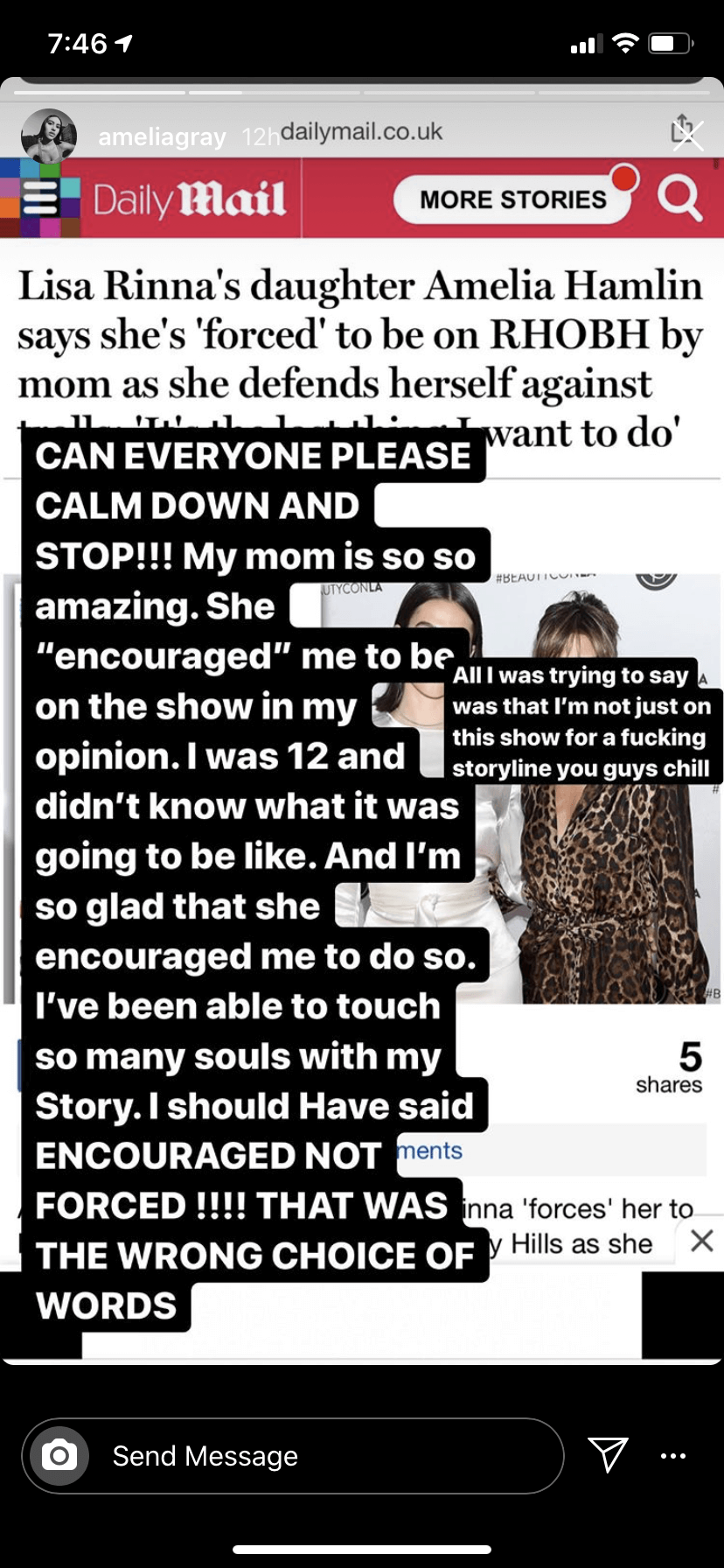 Shortly thereafter making comments accusing her mother of forcing her to do reality TV — Amelia Hamlin took to her Instagram Story again — this time to backpedal on her first comment.