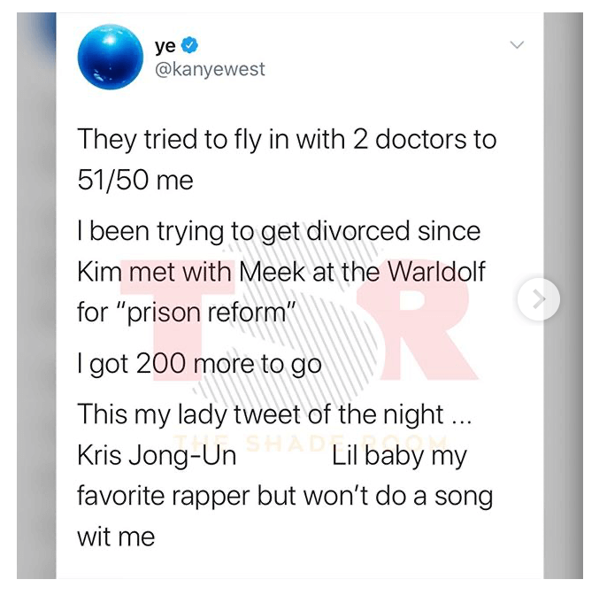 In another tweet, Kanye West dropped a bomb — he’s been trying to divorce Kim Kardashian since she had a meeting with Meek Mill at a hotel. “They tried to fly in with 2 doctors to 51/50 me. I been trying to get divorced since Kim met with Meek at the Warldolf for ‘prison reform’ I got 200 more to go,” he wrote on Twitter.