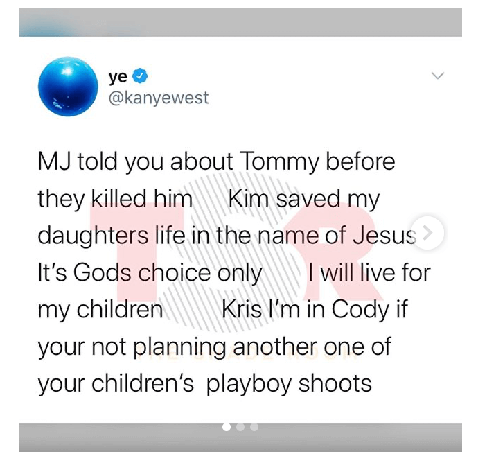 He continued, “MJ told you about Tommy before they killed him Kim saved my daughters life in the name of Jesus It’s Gods choice only I will live for my children Kris I’m in Cody if your not planning another one of your children’s playboy shoots.”