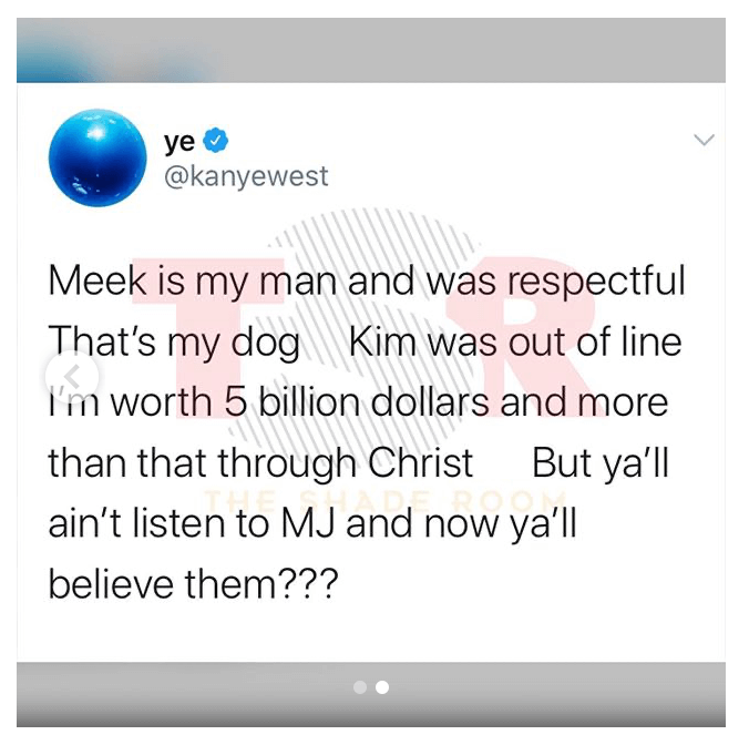 However, he’s not holding a grudge against Meek, “Meek is my man and was respectful That’s my dog Kim was out of line I’m worth 5 billion dollars and more than that through Christ But ya’ll ain’t listen to MJ and now ya’ll believe them???” the hip-hop star wrote, before saying that Kim “went out of line” because she and Kris allegedly put out a statement without his approval.