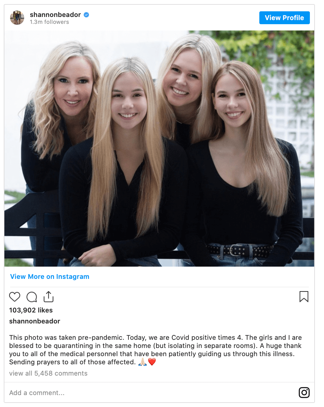 Shannon Beador took to Instagram on July 24 to share that she and her three daughters had tested positive for Covid-19.